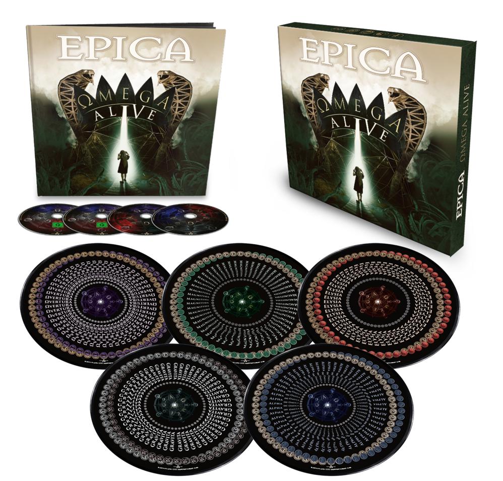 Лимитированный в 1000 копий делюкс бокс-сет EPICA - Omega alive. Вкобчает в себя 5 винилоыфх пластинок 10* ( 5x 10'' Picture LPs - Zoetrope Vinyl ) + Earbook 2-CD+DVD+Blu-ray.